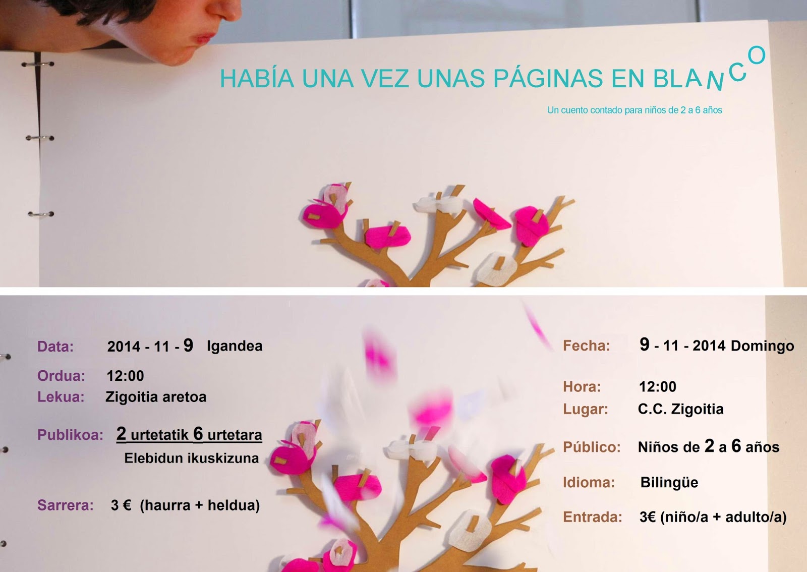 Actividad de dinamización de públicos en familia con la compañía Laboratoria presentando en Zigoitia Blanco más blanco igual a cuento