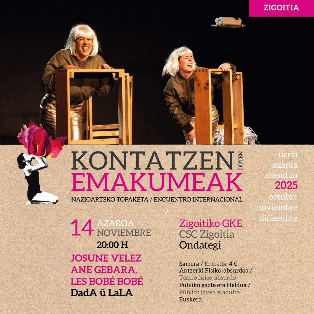 «Gasteizko arte eszenikoetan murgilduta dauden hiru kidek sortzen dute Les Bobé-Bobe antzerki taldea. 2019ean elkarrekin egin zuten euren lehendabiziko antzezlana. ‘Eta Kittorik ez!’ izenekoa. Antzerki laburrarekin ‘Txilin hotsak’ aurkeztu zuten 2020an eta 2023an ‘(H)ondoko gela’ Thriler absurdoa rekin jarraitu zuten. Oraingoan Dadaismoan sartu dira buru belarri ‘Dada U Lala’ antzerki absurdo, fisiko eta lotsagabearekin. Bilboko Loraldia jaialdian estrenatu zen 2024ko martxoan. Ane Gebara, Josune Velez de Mendizabal eta Jasón Guerra.»